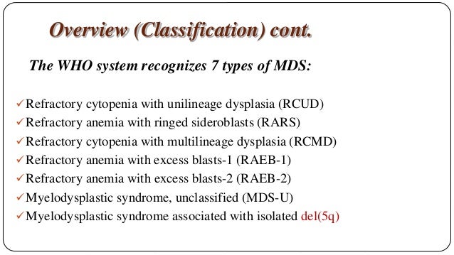 Types of Myelodysplastic Syndromes Myelodysplastic syndromes MDS are classified using the World Health Organization WHO classification system which was most recently updated in 2016. The different types of myelodysplastic syndromes are diagnosed based on certain changes in the blood cells and bone marrow. Later symptoms may include feeling tired shortness of breath bleeding disorders anemia or frequent infections.