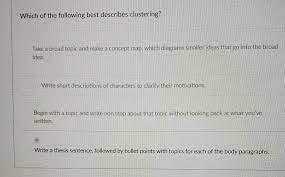 Which sentence best describes clustering. Go to next question. Was asked on May 31 2017. Which sentence best describes clustering. You write down words or ideas in chronological order. Thinking about the content layout and structure of your document Making yourself write without stopping for 10 minutes or so and identifying the best point in the draft Talking. Circle or underline it.