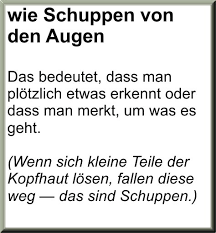Uns fällt es wie Schuppen von den Augen und all unsere negativen Erlebnisse den Neid die Missgunst die Gier Habsucht Unehrlichkeit und übermäßigen Alkohol- und Drogenkonsum anderer Menschen werden von ihr bestätigt. Many translated example sentences containing schuppen von den augen English-Spanish dictionary and search engine for English translations. Saulus erkannte schließlich seinen Irrtum und in.