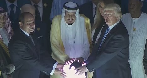 The witch hunt continues against Donald Trump the most unfairly treated politician of all time. Trump grabs glowing Saudi orb sparks jokes memes US president Arab leaders in Riyadh launch anti-extremism center by touching illuminated globe. Donald Trump placed his hands on a strange glowing orb on his trip to Saudi Arabia. RIYADH Saudi Arabia A mysterious glowing orb is exerting uncanny power over the worlds social media. The internet was confounded on Sunday by Donald Trump touching a glowing orb. Many compared the glowing orb to sci-fi or fantasy stories and mocked the bizarre scene. When Trump was seen touching a glowing orb in Saudi Arabia the memes came pouring in.