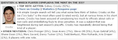 Is Sidney Crosby a cry baby. Cloud State University in Minnesota where she also plays hockey though she is a goalie. Crosby is a whiner and a baby.